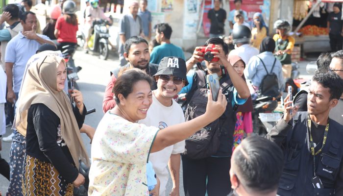 LUWUK, ZONASULAWESI — calon wakil gubernur Sulawesi Tengah termuda pada pilkada 2024, Abdul Karim Aljufri, jadi rebutan swafoto saat blusukan ke Pasar Pasar Simpong, Kecamatan Luwuk Selatan, Kabupaten Banggai, Minggu (15/9/2024).