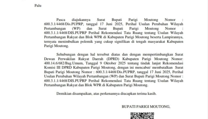 Keputusan tersebut tertuang dalam Surat Bupati Parimo Nomor 500.10.2.3/1/PUPRP, bertanggal 10 Oktober 2025, yang ditujukan kepada Gubernur Sulawesi Tengah di Palu. Surat itu berstatus penting dan menjadi tindak lanjut atas dinamika serta polemik yang muncul di tengah masyarakat pasca pengajuan usulan WP sebelumnya.
