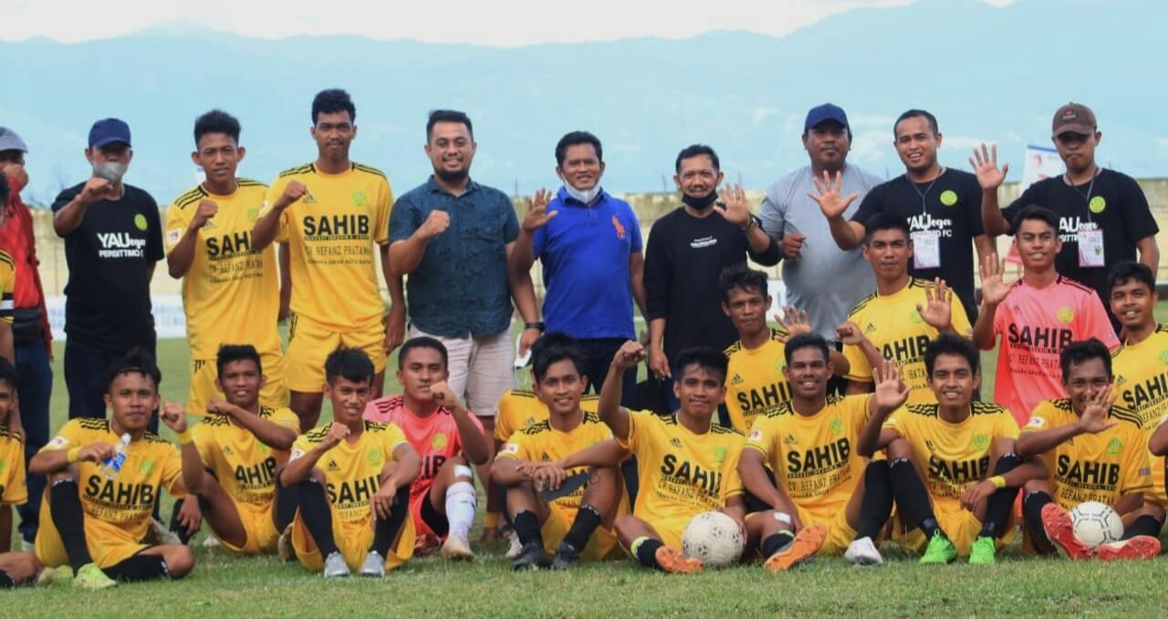 Pelatih foto bersama para pemain dan Anggota DPRD Kabupaten Parimo, Nurul Qiram (abu-abu), Sutoyo (biru), dan Anggota DPRD Sulteng, Ibrahim A Hafid (hitam) serta para pemain Persittimo. Foto : Zona Sulawesi/Miftahul Afdal