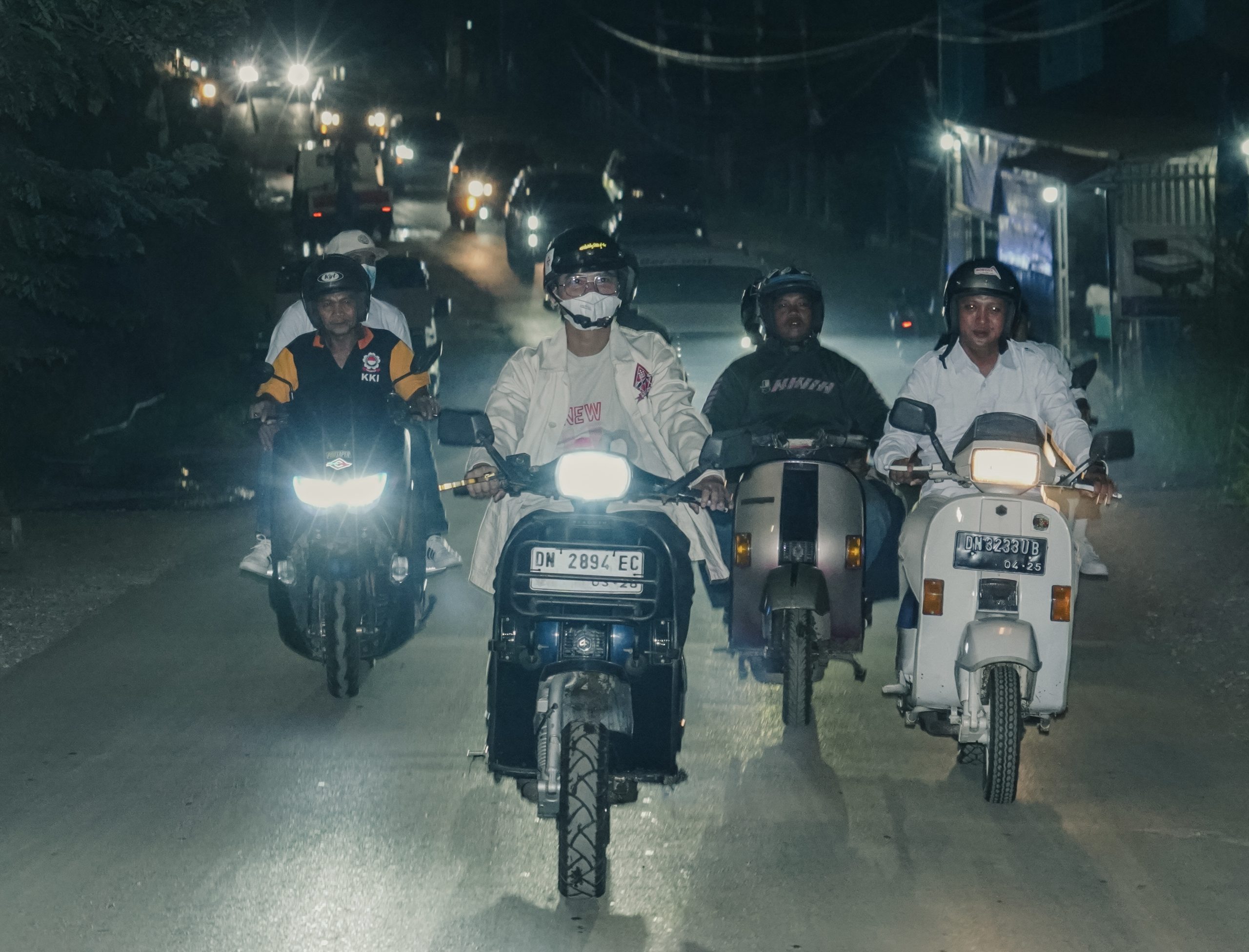 Dengan gaya yang sederhananya AKA sapaan akrabnya tiba di lokasi acara menggunakan sepeda motor Vespa.