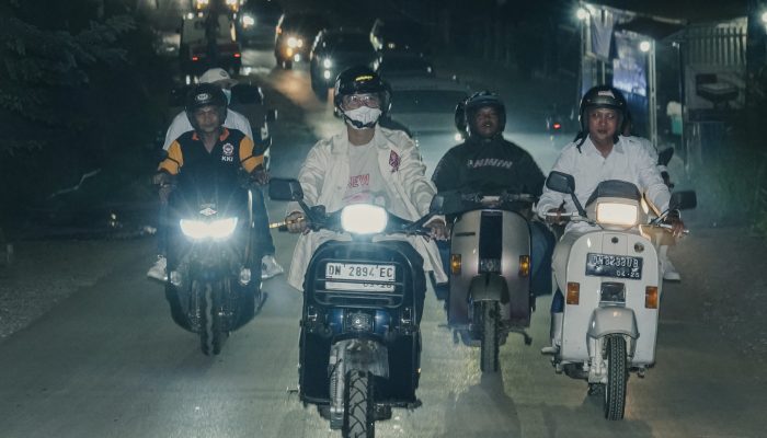 Dengan gaya yang sederhananya AKA sapaan akrabnya tiba di lokasi acara menggunakan sepeda motor Vespa.