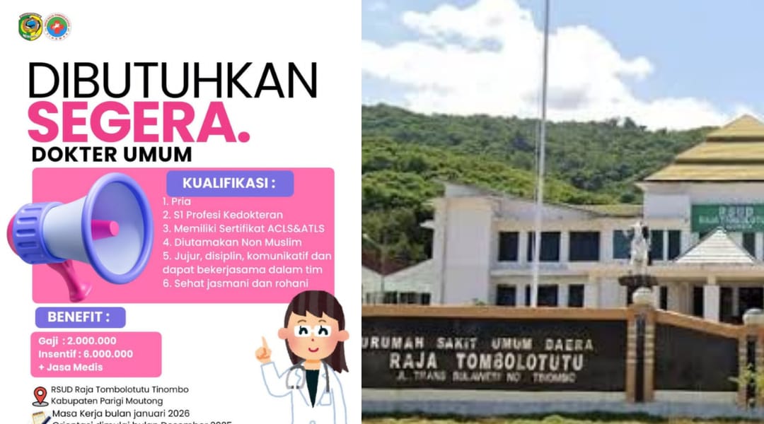 PARIMO, ZonaSulawesi.id – Poster lowongan kerja dokter umum yang dikeluarkan Rumah Sakit Umum Daerah (RSUD) Raja Tombolotutu Tinombo menuai kritik publik, setelah salah satu poin persyaratannya dinilai bermuatan diskriminatif. Dalam poster yang beredar di media sosial, tercantum salah satu kualifikasi yakni Diutamakan Non Muslim.